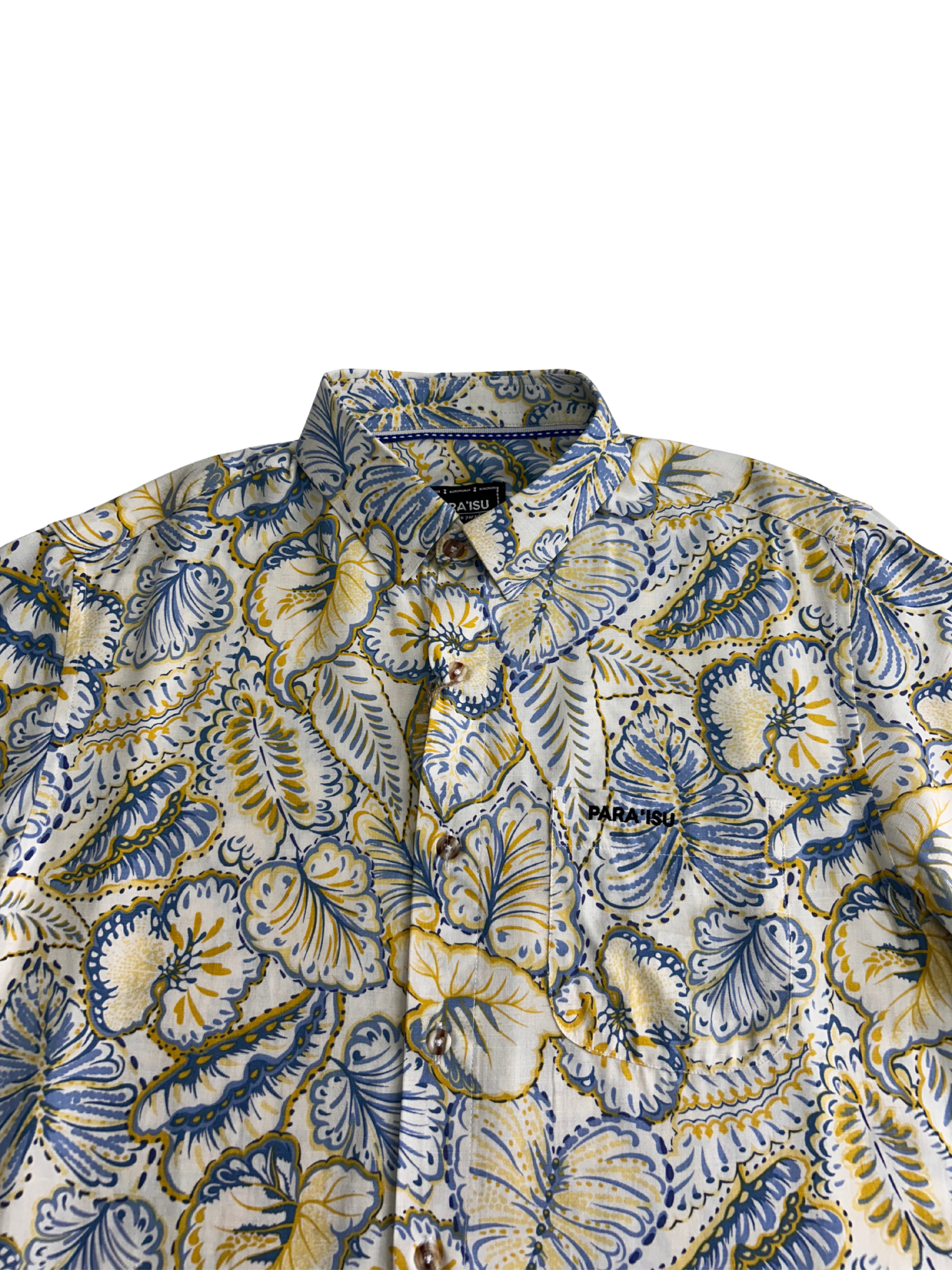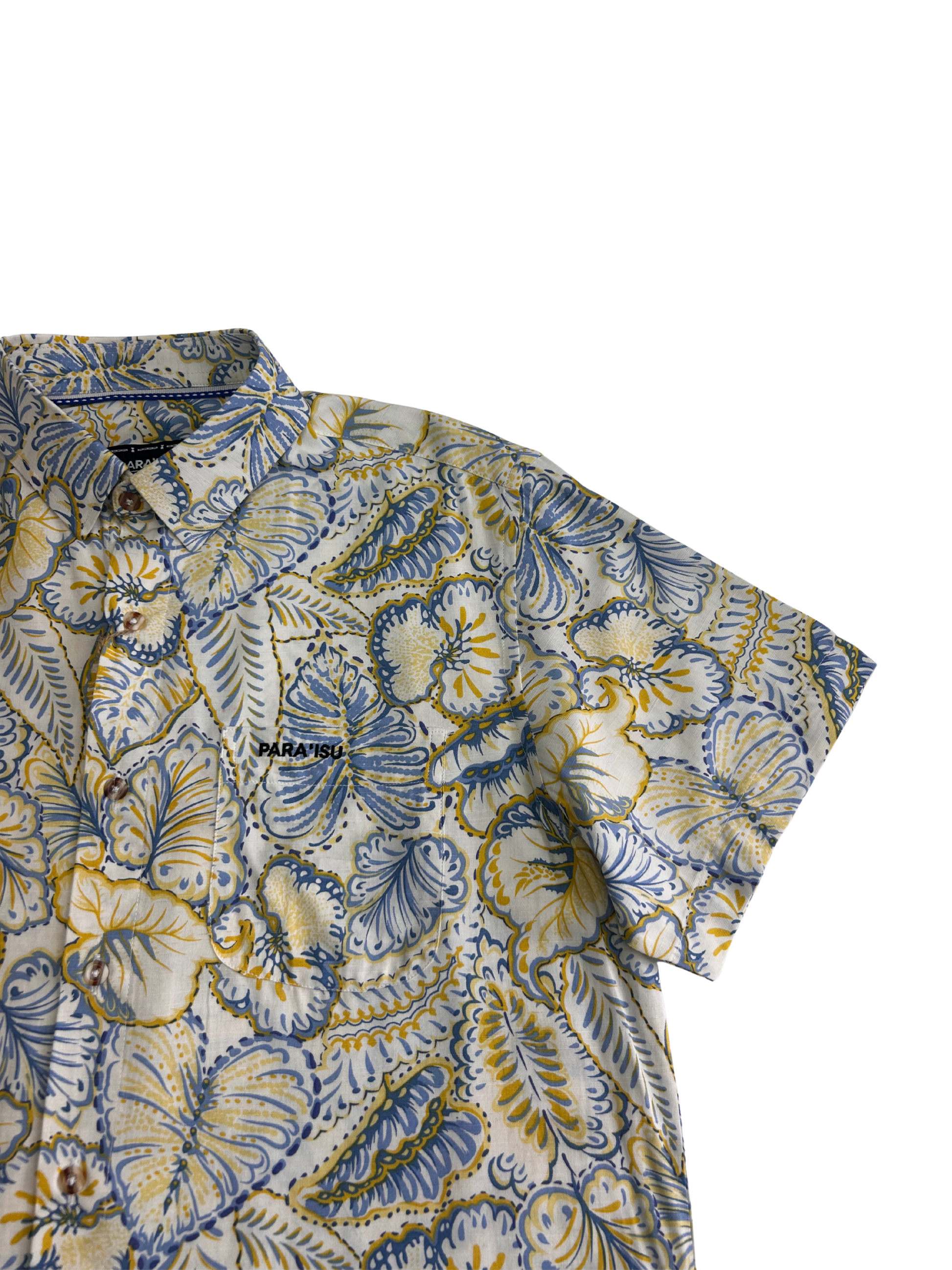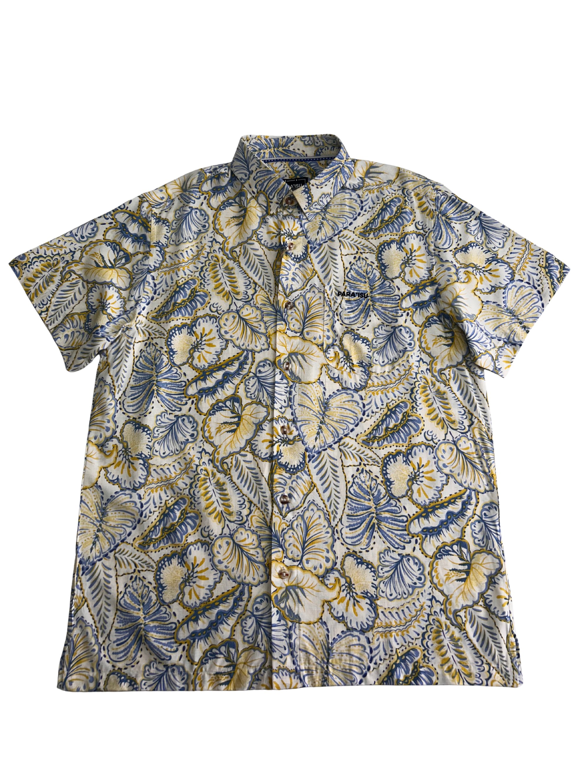 White button up with yellow and light blue leaf print